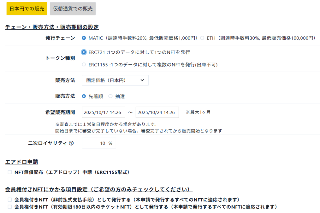 次にNFTを販売する通貨、NFTを発行するブロックチェーン、販売方法や期間の設定を行います。ここでは日本円での販売方法について解説します(仮想通貨で販売されたい方は事前にマイページ→報酬管理から仮想通貨ウォレットの登録が必要となります。詳細はこちら)。