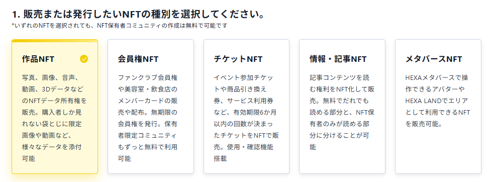 ここではHEXA(ヘキサ)でNFTを販売するまでの流れと、作成・発行したNFTをコレクション設定したり、タグの設定をする方法、そしてコミュニティ(NFTを購入して保有している方だけに情報発信することができます)を立ち上げる方法まで機能を網羅的に解説します。HEXAでは、画像・動画・音声・3Dデータ、記事コンテンツ等の様々なデータをNFT化することができます。