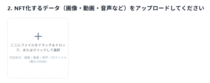 NFTの種類を選択したら次は、データの登録です。NFTにしたい画像や動画、音声、3Dデータなどを+ボタンを押してアップロードしてください。一度に複数のNFTを発行する場合、複数のファイルを同時にアップロードすることもできます。