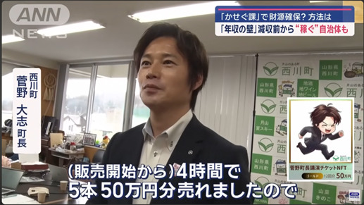 山形県西川町は2024年度にかせぐ課を設置し、町の財源確保のために町自らがかせぐ取り組みを行っています。その取組の一環として、菅野町長、内藤副町長自らも町のために出稼ぎし、高齢者福祉施策に向けた財源確保を図っています。さらに講演や面談によって、西川町が行っている先進的な取組みや町長の想いを全国に発信し、町をPRすることも目的としています。すでに町長の講演権NFTは300万円分が完売しています。また、町を訪れるとビールが飲めてビール工場が見学できるチケットNFTも完売しています。