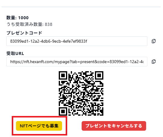 すでに過去にプレゼントコードを発行している場合でも、保有NFTから「プレゼントコード」を確認する画面で、「NFTページでも募集」のボタンを押していただくことで、ボタンを出現させることができます。