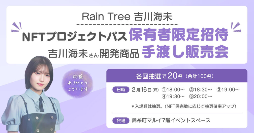 2月16日(月)18:00~21:00 NFT保有者限定・RainTree 吉川海未手渡し販売会